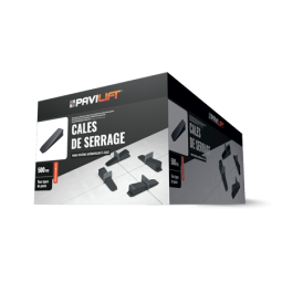 Les cales de serrage PAVILIFT font partie intégrante du système autonivelant par cale : elles permettent de niveler les carreaux les uns par rapport aux autres de façon rapide et fiable. Grâce à un design optimisé — crans nombreux et de faible hauteur — jusqu’à 80 % du serrage peut être réalisé à la main. Pour les carreaux plus lourds ou épais, l’usage d’une pince est recommandé.